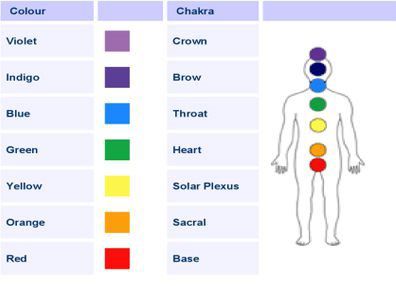 Each chakra has a different frequency of vibration, symbol, color, and sound that it is attuned to. When the chakra is balanced, clear, and energized it would be in tune and play the most wonderful sound of its own, emitting the proper vibration for that chakra. Many things can affect the vibrations including sounds of voice, drums, music, chants, mantras, the vibration energy of colors, and of course gemstones. All colors and sounds are vibrations and using the sounds and colors of the chakras assist them in becoming aligned and balanced. The colors of the chakras are that of the rainbow; starting at the root chakra black/red, orange, yellow, green/pink, light blue, indigo, and violet/white for the seventh chakra; as shown in the picture above.